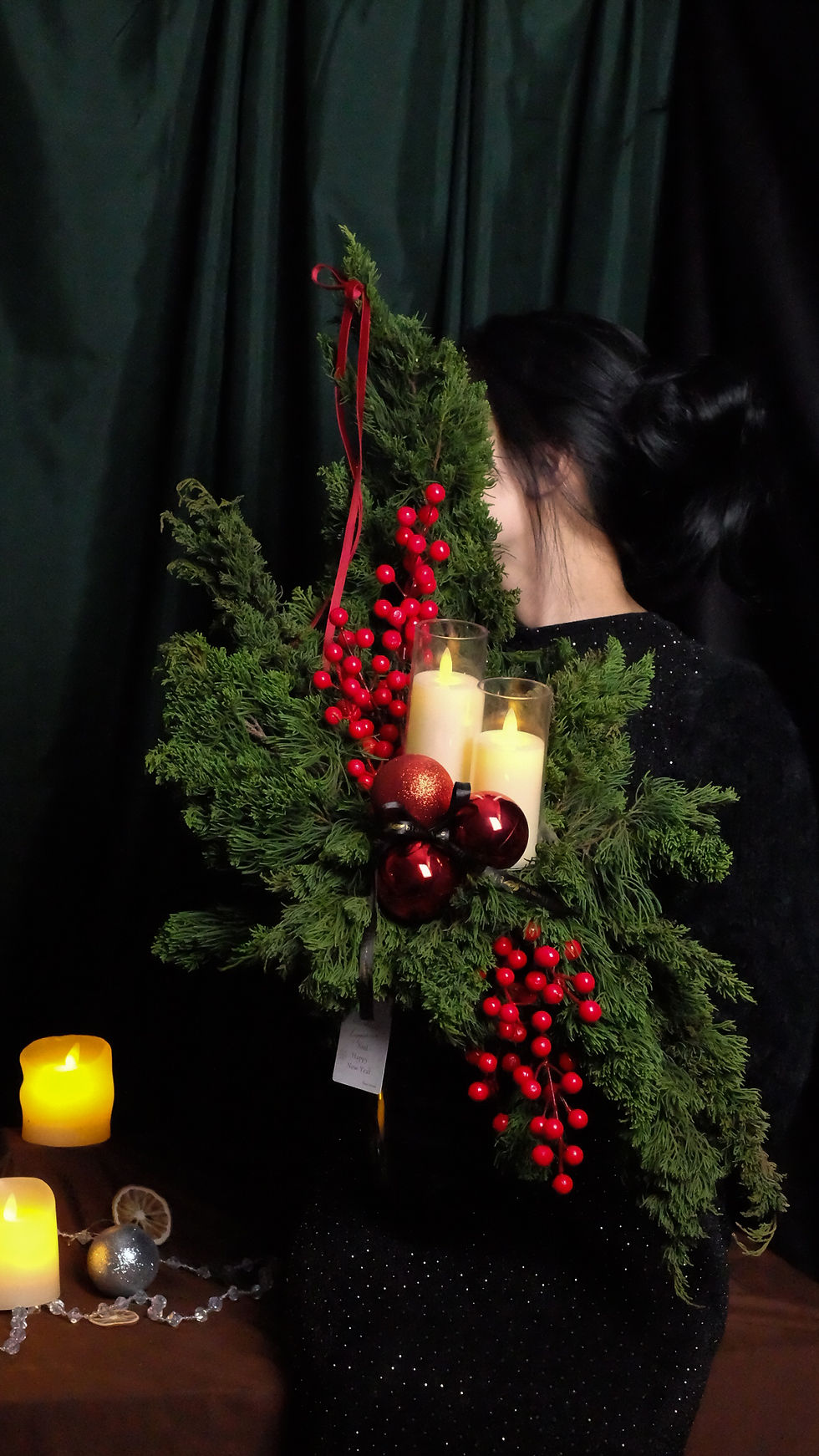 A magical Christmas arrangement featuring fresh pine leaves, bright artificial berries, a classic red Christmas ball, and a soft LED candle at its heart. Luminous Glow brings gentle light and festive color to any room — perfect for cozy evenings.